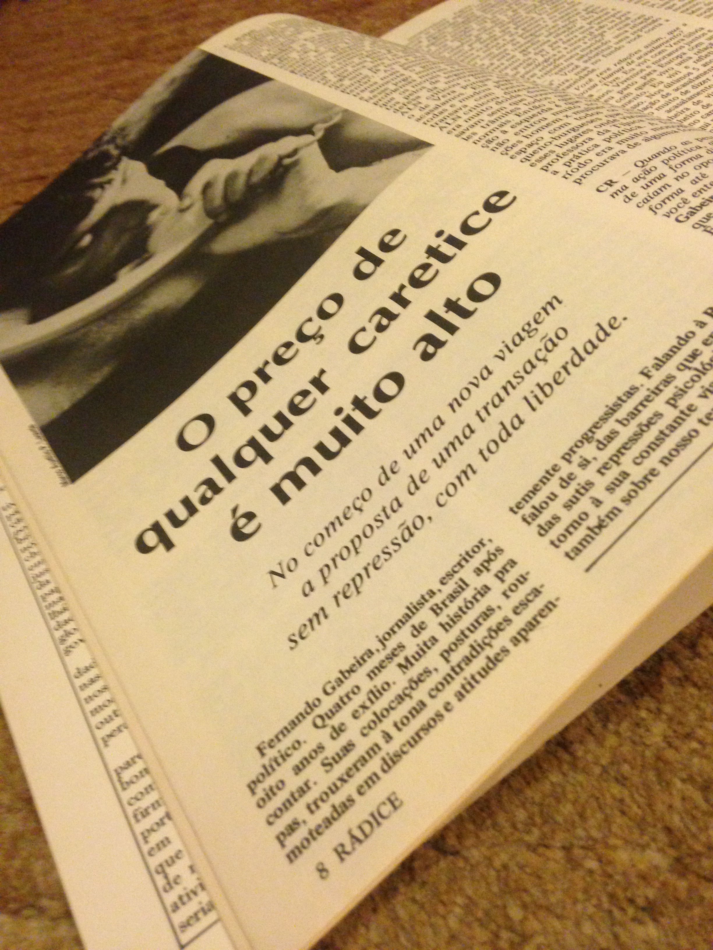 RV | Várias bancas foram queimadas quando recomeçaram a sair as revistas pornográficas, banidas por todo o período da ditadura. O movimento direitista puritano com estas ações provocou uma reação do governo, que passou a exigir que essas publicações saíssem ensacadas em sacos plásticos. Isso justo antes da saída da edição nº 14 da Rádice — ‘O Combate Sexual da Juventude’ — que tratava da questão da sexualidade e política (nela fizemos um resumo do livro do Reich de mesmo nome, e a matéria era ilustrada com uma sequência de fotos de um casal que começava a fazer amor em uma mesa da cozinha). Assim, tivemos que suspender a distribuição em caráter de urgência e arranjar de ensacar a revista, para não corrermos o risco de apreensão ou queima de banca. Foi estressante, mas divertido; falávamos: ‘quem diria, depois de tudo sermos apreendidos como revista de sacanagem!’ rs.