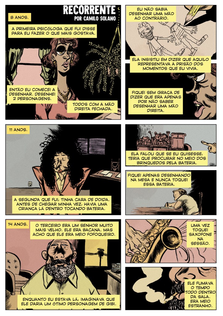 * Camilo Solano é de São Manuel, no interior de São Paulo. Sua primeira HQ independente, Inspiração – Deixa entrar Sol nesse porão foi seu trabalho de conclusão de curso que lhe garantiu duas indicações ao 26º Troféu HQMix como “Novo Talento Roteirista” e “Novo Talento Desenhista”. Desde então, lançou Onde eu tavo? em 2013 e Captar ao lado de Thobias Daneluz em 2014, que também foi indicada no 27º Troféu HQMix. Em 2015, lançou o álbum independente Desengano, cujo prefácio foi escrito pelo principal nome do quadrinho underground americano, Robert Crumb. Em 2016, lançou Solzinho e, ao lado do irmão Aldo Solano, lançou Badida. No mesmo ano lançou Semilunar, que saiu pelo PROAC. Sua obra procura fazer transparecer as tragicômicas situações do cotidiano de pessoas comuns, que é também o seu universo, conjuntamente à sua necessidade de fazer interagir a música à produção em quadrinhos.