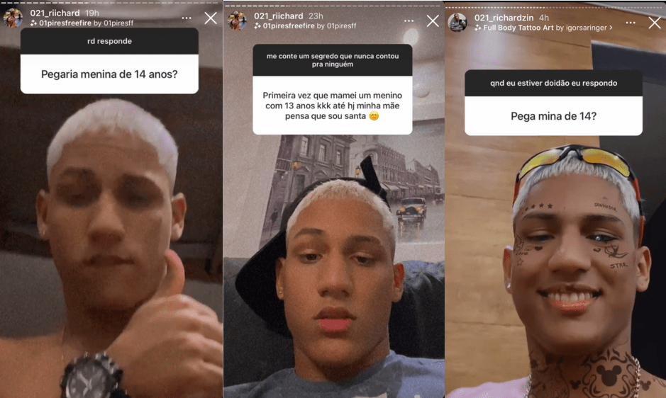 O influencer Richard Gomes, por exemplo, alterna dancinhas do Tiktok com sketches cômicas e caixas de perguntas. Muitas vezes essas perguntas que ele escolhe responder questionam se ele “pegaria” menores idade, por exemplo, “mina de 14.” A resposta parece sempre ser sim. Recentemente Gomes postou uma confissão de um de seus seguidores após pedir para eles contarem um segredo que nunca contaram pra ninguém: “Primeira vez que mamei um menino com 13 anos kkk até hoje minha mãe pensa que sou santa.” Numa enquete nos Stories do Instagram vemos que 69% de seus seguidores que responderam teem menos de 16 anos.