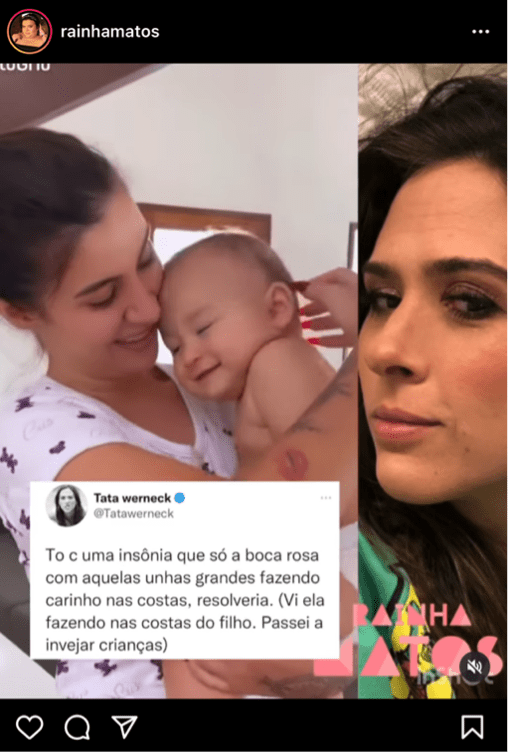 Um tweet da humorista Tatá Werneck viralizou subsequentemente nas mesmas páginas de fofoca do Instagram, no qual Werneck diz estar com uma insónia que só a Boca Rosa “com aquelas unhas grandes fazendo carinho nas costas, resolveria..” Werneck continua: “Vi ela fazendo nas costas do filho. Passei a invejar crianças.”
