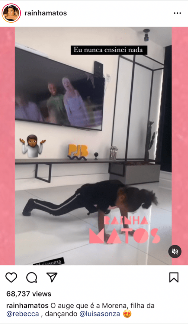 O Instagram de fofocas @Rainhamatos declara: “O auge que é a Morena, filha da @rebecca, dançando @luisasonza.” Um leitmotif dentro de um leitmotif. Em outra postagem a criança reaparece como símbolo de fofura – e, ousariamos dizer, sensualidade? Ousaríamos porque apenas constatamos, ou ao menos traduzimos, o que a pose da menina nos diz, o que a música que envelopa a imagem repete. E o que a legenda da foto literaliza para que não haja qualquer dúvida. “Olha só que linda a Morena, filha da cantora @rebecca, dançando a música da @anitta que se tornou trend na rede vizinha.”