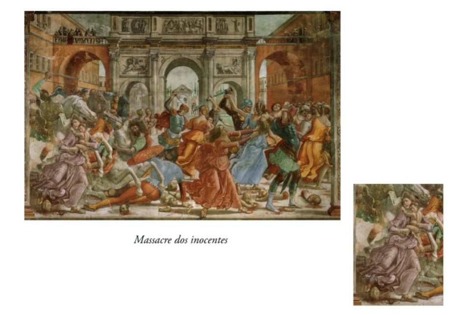 [nas] encantadoras crianças que surgem em ambas as extremidades do Casamento da Virgem; [nas] verdadeiras bailarinas que atravessam A nomeação de São João Baptista e, evidentemente — sob os traços de Salomé — O banquete de Herodes; [como] uma representação em baixo-relevo, mas também um anjo — um jovem alado, efeminado, vestido all’antica — na Aparição do Anjo a Zacarias; [como] as quase ménades em fúria, ou avatares de Medeia, no violentíssimo Massacre dos Inocentes.[26]