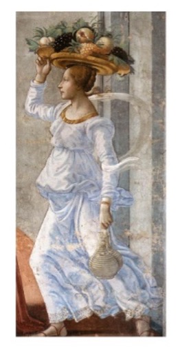 Trata-se, como podemos observar, de uma serva. Segundo Didi-Huberman, “[não a heroína de uma história], mas apenas uma serva transportando na cabeça uma bandeja com frutos”[22]. Os olhos do historiador se voltam para essa figura que poderia facilmente ser dispensada. Dessa figura que poderíamos chamar de marginal: é apenas uma serva. Mas marginalidade dupla: porque também aparece nas margens do quadro. Ela seria extremamente necessária na narrativa do nascimento de São João Batista? De qualquer forma ela está ali — em puro movimento. Ela se destaca até mais que Santa Isabel. As outras mulheres do afresco aparentam certa imobilidade. A questão para Warburg recuperada por Didi-Huberman a partir dessa figura feminina diz respeito, segundo ele mesmo, a “um caso de desejo”, a um “sintoma inconfessável” que aparece no meio das inúmeras cenas religiosas representadas na capela Tornabuoni. Mas dizer que se trata de um caso de desejo ou de um sintoma inconfessável talvez seja muito pouco elucidativo.