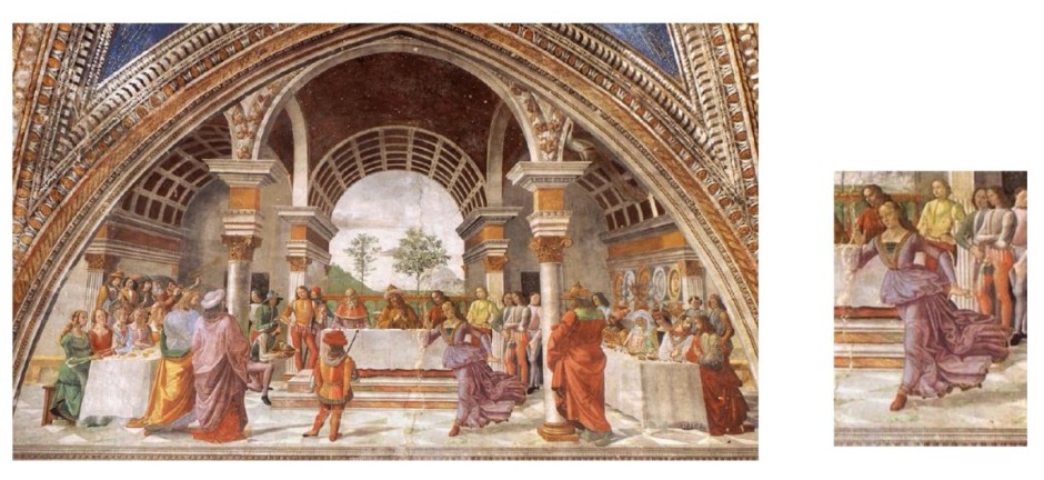 Essa é uma descrição muito pontual da pintura. Exata naquilo que podemos ver. Mas, seria preciso que lançássemos um olhar para aquilo que, embora Vasari mencione, está fora do que nomeia o quadro. O título diz respeito certamente a O nascimento de São João Batista, mas Aby Warburg chama a atenção para a personagem feminina de Ghirlandaio “que vemos entrar” a partir do extremo direito do afresco da capela (“pela orla, pela margem, pelas bordas”). Essa personagem feminina que parece vir de um outro espaço, “que Warburg chamou de ‘senhorita apressada’, mas também de ‘deusa pagã no exílio’, ninfa da antiguidade — de um outro tempo — implicava para ele um claro sintoma[21].