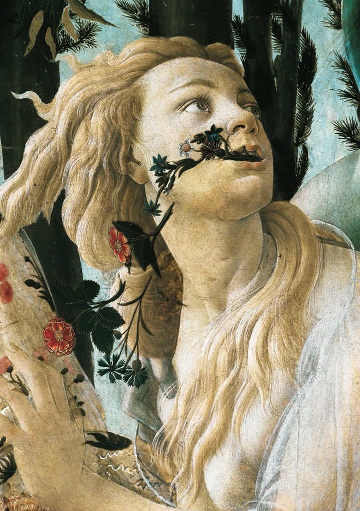 Como uma simples serva que traz elementos para restituir as forças de Santa Isabel, ou, em outro afresco, como a responsável pela morte de São João Batista — inscrição curiosa e bastante cruel. “Caso de desejo, como um sintoma inconfessável no meio da cena religiosa” — escreve Didi-Huberman. Warburg havia decidido olhar para essa forma sintomática. “Sempre ela que trazia vida e movimento a representações habitualmente calmas”. Olhar para as margens dos quadros do Renascimento — olhar, segundo Warburg, para “essas formas que parecem varrer a representação (tal como uma corrente de ar)”[32]. E “de fato [escreve Didi-Huberman], passam-se muitas coisas perturbadoras nas margens dos quadros da Renascença, como na Primavera, onde vemos, à direita, saindo do bosque, Zéfiro fecundando a ninfa Clóris, e esta desde logo ‘a vomitar’ os seus filhos sob a forma de um rosário de flores que saem de sua boca”[33]. Esses elementos parecem sempre estar vindo de um outro lugar, de um outro tempo e invadindo as histórias retratadas.