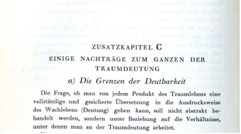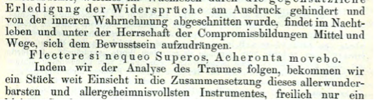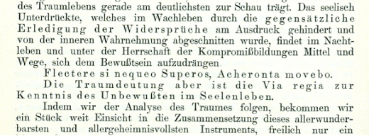 [Die Traumdeutung aber ist die Via regia zur Kenntnis des Unbewussten im Seelenleben.]