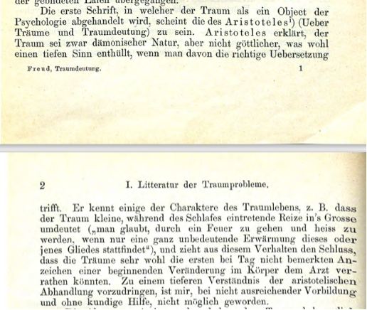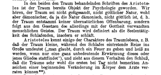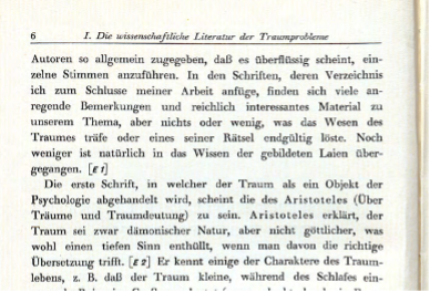 [Die erste Schrift, in welcher der Traum als ain Objekt der Psychologie abgehandelt wird, scheint die des Aristoteles (Über Träume und Traumdeutung) zu sein. Aristoteles erklärt, der Traum sei zwar dämonischer Natur, aber nicht göttlicher, was wohl einen tiefen Sinn enthüllt, wenn man davon die richtige Übersetzung trifft. Er kennt einige Charaktere des Traumlebens, z. B. dass der Traum kleine, während des Schlafes eintretende Reize ins Grosse umdeutet (“man glaubt, durch ein Feuer zu gehen und heiß zu werden, wenn nur eine ganz unbedeutende Erwärmung dieses oder jenes Gliedes stattfindet”), und zieht aus diesem Verhalten den Schluß, daß die Träume sehr wohl die ersten bei Tag nicht bemerkten Anzeichen einer beginnenden Veränderung im Körper dem Arzt verraten könnten. Zu einem tiferen Verständnis der aristotelischen Abhandlung vorzudringen, ist mir, bei nicht ausreichender Vorbildung und ohne kundige Hilfe, nicht möglich geworden.]