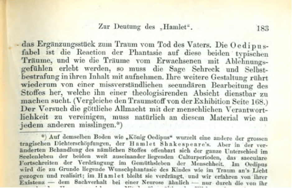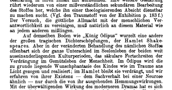 Na seção D do quinto capítulo do livro, que se ocupa dos chamados sonhos típicos, encontra-se a extensa análise da lenda de Édipo, seguida por uma rica comparação entre a peça de Sófocles e o Hamlet de Shakespeare. Ambos os textos comparecem de fato na primeira edição de A interpretação dos sonhos — embora o excurso sobre Hamlet ocupasse inicialmente o rodapé do livro[28]. Apenas em 1914 este trecho será deslocado para o corpo do texto, em um período no qual (como será indicado mais adiante) torna-se necessário para Freud definir uma fronteira entre a noção de complexo de Édipo (uma expressão que não aparece no texto de 1900) e o debate acerca do simbolismo no sonho. Em todas as edições posteriores este trecho irá permanecer no corpo do texto[29].