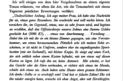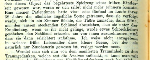 [Eine meiner Patientinnen hatte vier oder funfmal im Laufe ihrer 38 Jahre die namliche angstliche Scene getraumt, dass sie verfolgt werde, sich in ein Zimmer fluchte, die Ture zumache, dann offne um den aussen steckenden Schlussel abzuziehen, dass sie unter der Empfindung, wenn es ihr gelinge, werde etwas Schreckliches geschehen, den Schlussel erhasche um von innen zuzuschliessen, und dass sie dann erleichter aufatme. ich weiss nicht anzugeben, in welches fruhe Lebensalter diese kleine Scene, bei der sie naturlich nur Zusschauerin gewesen ist, verlegt werden sein muss.]