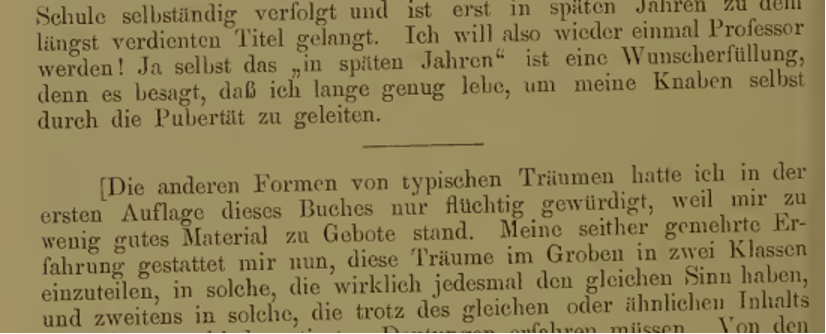 Ao final, a alteração inserida na edição de 1911 não será exatamente esta: à frase iniciada com a afirmação de que “os sonhos das crianças pequenas são simples realizações de desejos” [“Die Träume der kleinen Kinder sind simple Wunscherfüllungen”][37] uma outra palavra será acrescentada: “os sonhos das crianças pequenas são com frequência simples realizações de desejos”[38] [“Die Träume der kleinen Kinder sind häufig simple Wunscherfüllungen”].