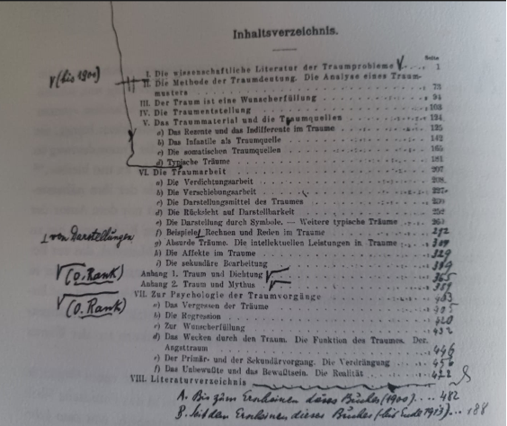 A história das edições da Traumdeutung e a sua relação com o movimento psicanalítico têm sido objeto de estudo nas últimas décadas, embora a questão praticamente não merecesse atenção antes do estudo “Metamorfoses de A interpretação dos sonhos” [“Metamorphosen der Traumdeutung”][8] pela pesquisadora e psicanalista alemã Ilse Grubrich-Simitis, publicado em 1999, e do livro Sonhar por Freud[9] [Träume nach Freud] de Lydia Marinelli e Andreas Mayer, no ano de 2002. A importância destes dois trabalhos para as formulações que apresentamos a seguir ultrapassa largamente a formalidade das citações e das referências bibliográficas.