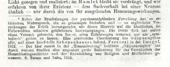 O deslocamento de uma passagem cuidadosamente composta, que ascende da invisibilidade do rodapé para o texto principal, evidentemente possui algum significado. O texto não é novo, mas a edição de 1914 apresenta neste trecho uma composição que reforça, por intermédio da literatura, a ideia da transmissão histórica de certos conteúdos da vida psíquica, como se Édipo e Hamlet fossem duas representações distintas, uma antiga e outra moderna, dessa mesma experiência. No momento em que o excurso sobre Hamlet é incorporado ao texto principal, este trecho parece desvencilhar-se da rubrica dos “sonhos típicos”, que agora indica somente uma espécie de atalho para a primeira exposição psicanalítica sobre o conflito edipiano. Embora até a edição de 1914 a expressão “complexo de Édipo” não aparecesse em A interpretação dos sonhos (e no entanto ela já existia há vários anos na psicanálise), surge agora uma afirmação mais enfática do valor destes conflitos psíquicos que remetem à lenda de Édipo.