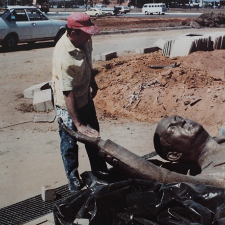 Os acidentes sempre geram desvios, mudanças e, às vezes, novas partidas. Ao folhear um livro sobre Brasília despretensiosamente, esbarrei com a imagem que integra a instalação da obra “Integração Nacional” presente na exposição. Quando vi a fotografia, me senti atravessado por um sentimento dúbio, como se tivesse encontrado uma espécie de segredo, algo que me havia seduzido por um indefinido fascínio, porém, carregada de uma melancolia estranha e incômoda. A fotografia feita em Brasília em 1981 compreende uma ação pequena e transitória: um homem de pé toca com sua mão uma estátua deitada. Com o braço esticado e o corpo estirado sobre um plástico que a protege, a estátua de Juscelino Kubitschek apoia a mão do homem anônimo, sob uma luz forte do sol de Brasília, criando um certo apagamento sobre seu rosto. A incompatibilidade das mãos, os tamanhos distintos, a diferença dos corpos criava um descompasso. Em retrospecto, talvez o que me chamou atenção nesta imagem era a posição da mão, o modo como aquele trabalhador encaixa sua mão sobre a de Juscelino, simulando o mesmo gesto que eu havia realizado no vídeo e na escultura que também integram a exposição na série didática do contato, mas realizada anteriormente ao encontro com a imagem.