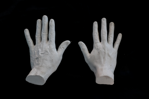 Já no caso da obra que é um par de mãos em gesso, acidentalmente, também tomou um outro rumo, uma outra montagem. A formulação inicial, já exposta em outro contexto, eram quatro mãos de gesso, quatro moldes de minha mão direita posicionados nos quatro cantos do lugar, desenhando um espaço. Quatro mãos em contato com uma superfície na qual aquelas sugerem, por meio de uma força e contato, a comunicação e o equilíbrio do lugar. Em vias de montar a exposição aqui no Paço, buscava alguém que pudesse me ajudar na execução dos moldes para o gesso. Uma amiga me enviou o contato por telefone. Ignorei por alguns dias até ligar para a pessoa indicada. Durante a conversa, compreendi que conversava com alguém chamado Juscelino que posteriormente me comentou que seu nome completo era Juscelino Pereira da Silva, era de Pernambuco e morava em São Paulo há mais de 30 anos. Ao notar a correspondência da situação, propus a Juscelino que fizéssemos dois pares: minha mão direita e sua esquerda, criando um exercício comparativo. Duas mãos descompassadas através de seu tamanho e de sua textura. Para minha surpresa observei situações curiosas na exposição onde algumas pessoas olhavam para sua própria mão, a reproduzir gestos, comparar a escala de suas mãos com as de gesso. Situações em que aparentemente algumas imagens devolvem ao público uma percepção do próprio corpo, uma sensação consciente de presença que me fazia às vezes borrar a divisão entre público, gestos e imagens.