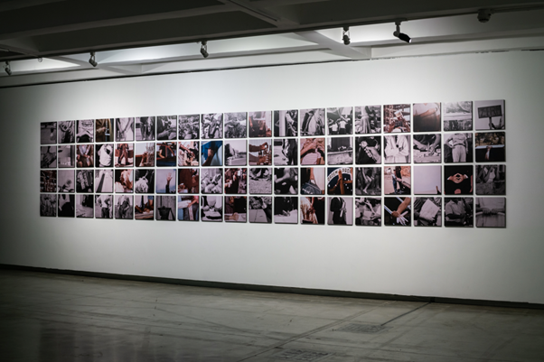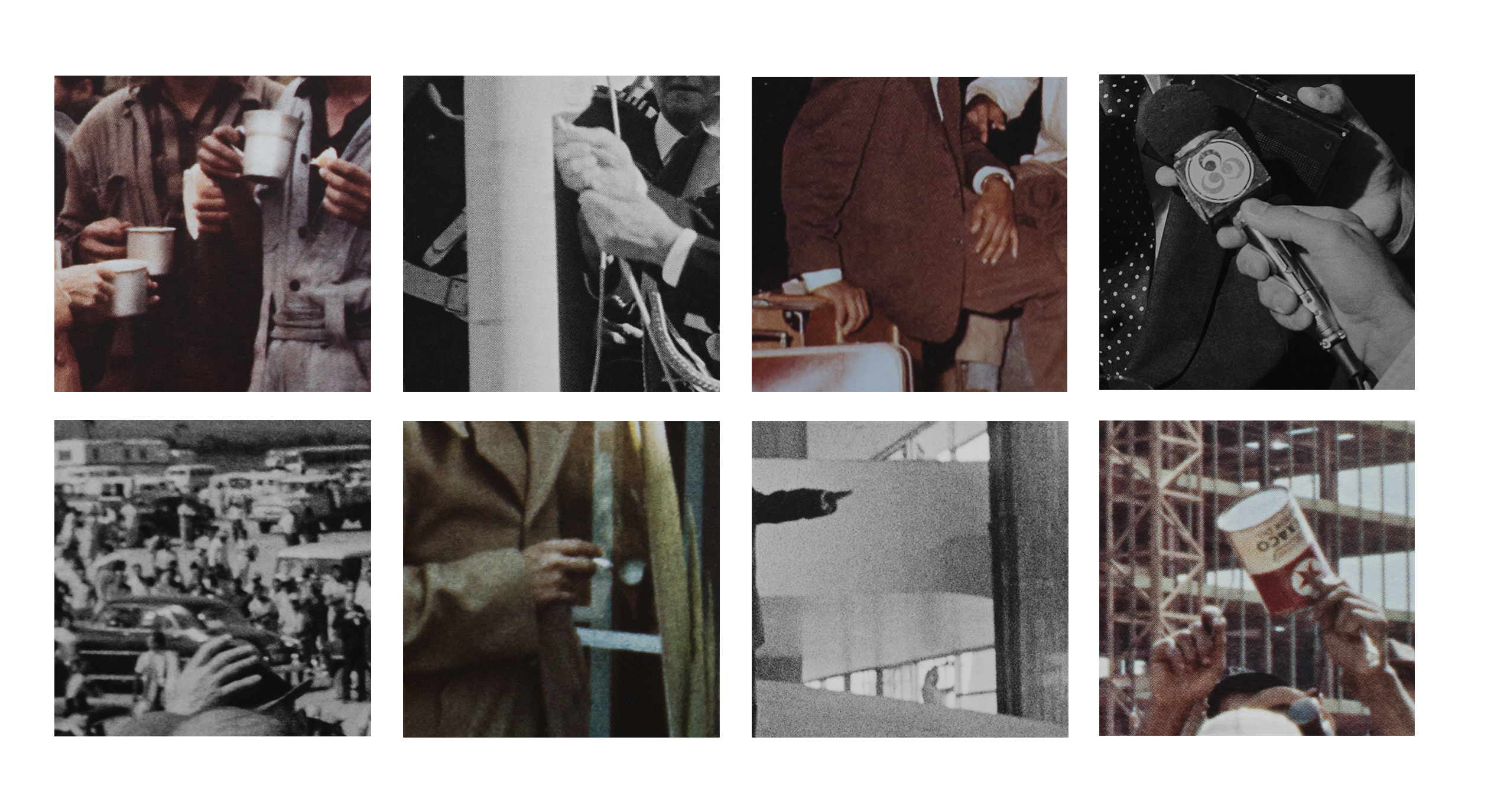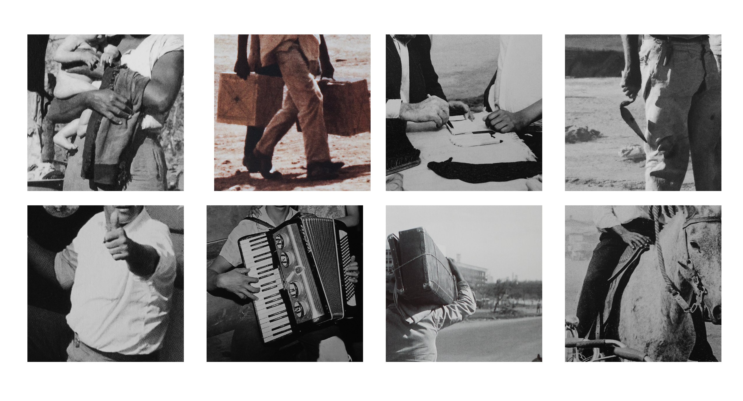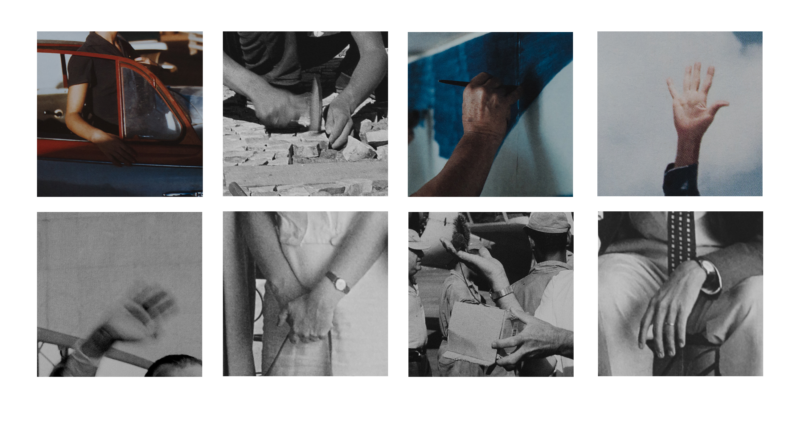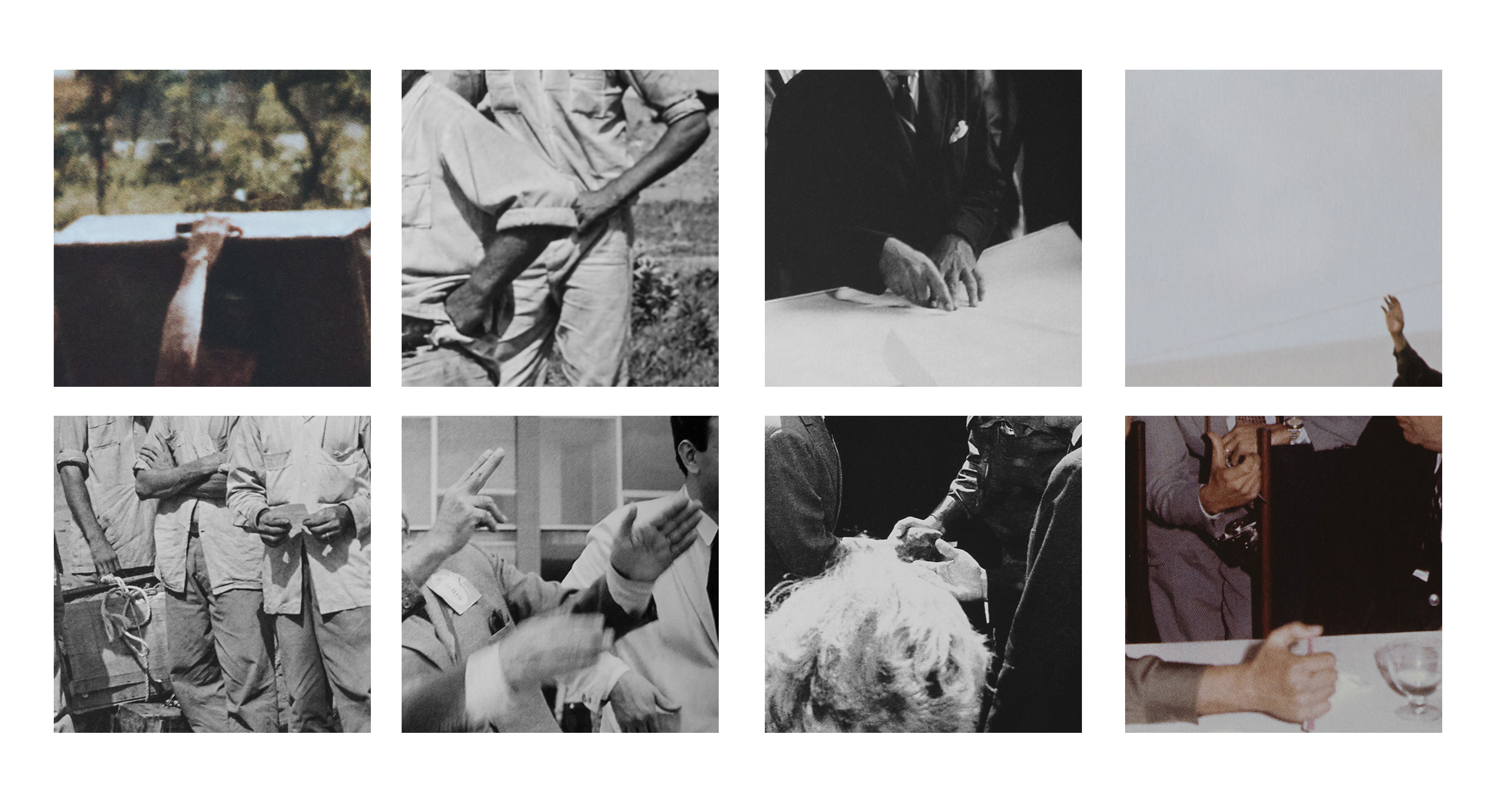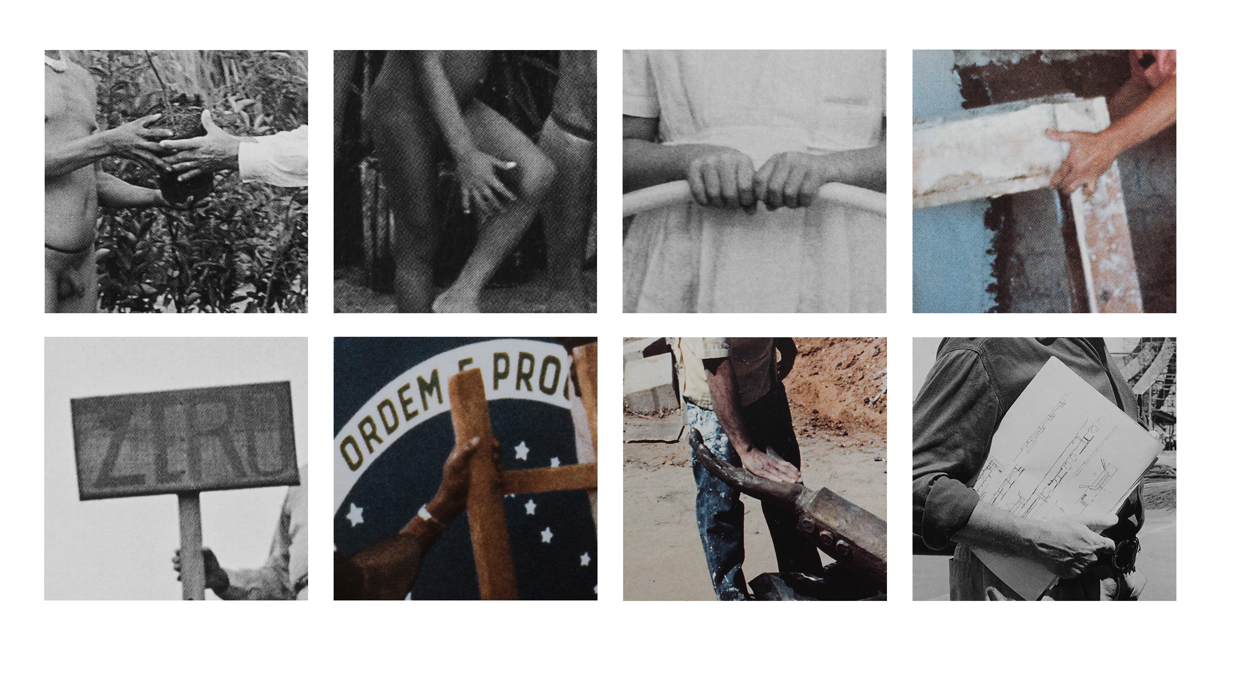 Da euforia e da vocação construtiva moderna, Brasília rapidamente se transformou em instrumento panóptico de vigilância e opressão. Embora carregue a melancolia de um pacto de “integração nacional” que nunca se constituiu, a imagem do operário com JK pressupõe uma inversão de poder, apresentando o operário na centralidade de seu desejo e gesto. Com este imaginário na cabeça, realizei o mosaico impresso da série “Integração Nacional” (2019), composto por uma coleção de 76 imagens realizadas entre 1958 e 1981 até a construção do memorial de Juscelino. Do enquadramento original foram recortados apenas detalhes que destacam as mãos em atividade. Nos deparamos com mãos que bebem, que martelam uma madeira, que estão segurando uma placa, que protegem o rosto do sol, que dividem uma muda de planta, que seguram a cabeça em momento contemplativo, que tocam a porta do carro, mãos em riste no ar, mãos que pressionam outros braços, que acenam, que apontam, que perguntam, compondo uma pequena história social por meio do gesto. Sem nenhum rosto aparente, a edição não revela identidades, apenas um grande mosaico de ações, um vocabulário. Penso que não há a priori nessas imagens, um suposto corpo comum. Talvez ele se constitua como tal temporariamente a partir do que tento realizar na exposição, à medida que crio narrativas e vizinhanças. Um exercício de montagem e ficção através do arquivo entre esses gestos silenciosos e transitórios. Gestos históricos e gestos ficcionais. Com este trânsito me permito aqui exercitar uma ideia de presença e talvez uma consciência de nosso passado, menos do que contar ou formular uma nova história.